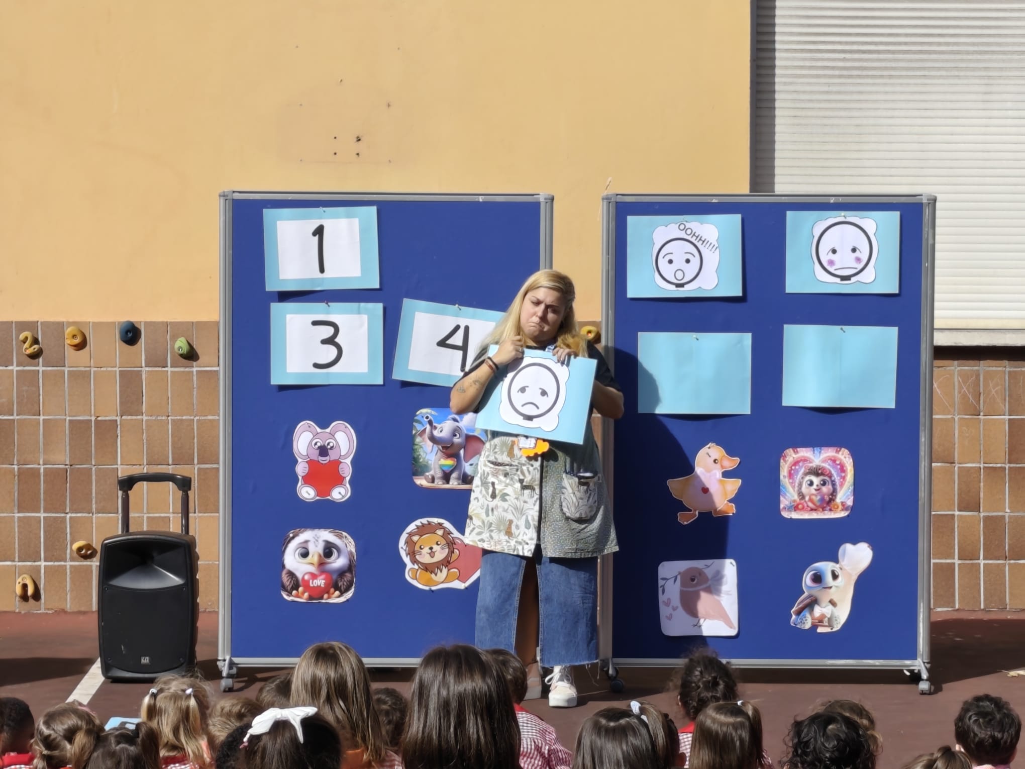 La actividad tuvo lugar el viernes 3, de 11:45 a 12:45. Durante el recreo, se preparó cuidadosamente el espacio en la pista de la Avenida de El Llano, colocando la megafonía, un panel con tarjetas y un gran dado. Este dado tenía seis caras numeradas del 1 al 6, y cada número correspondía a una emoción: