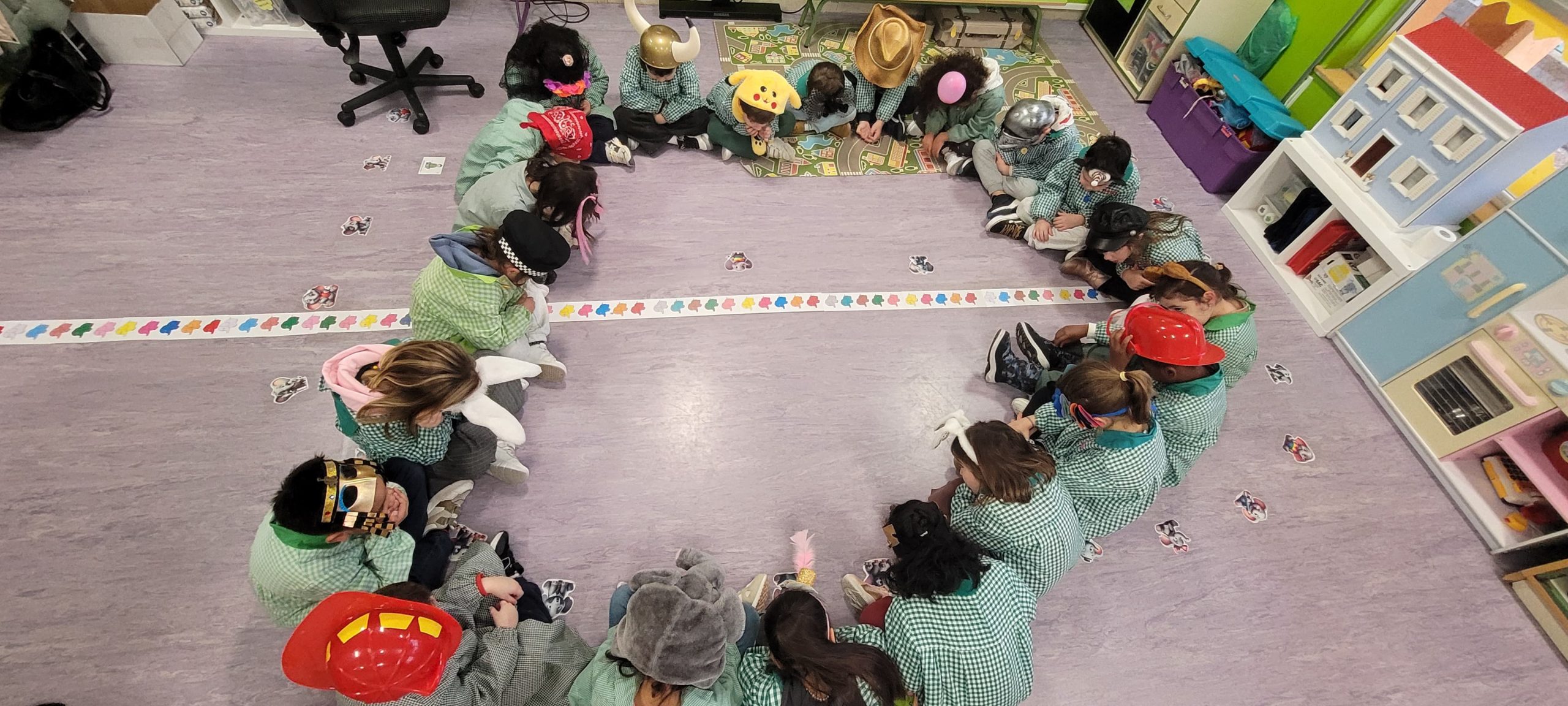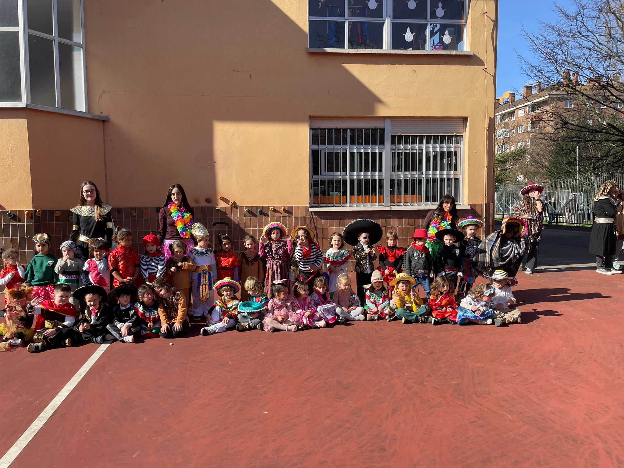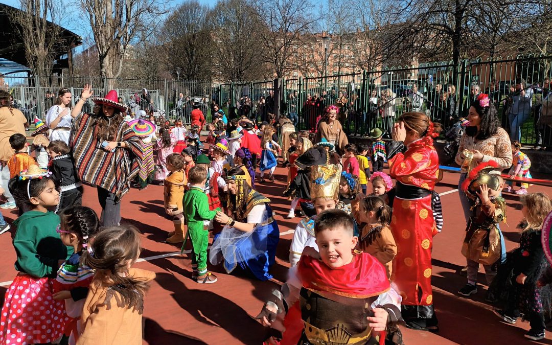 Este año hemos querido mantener la tradición: ¡La Patarrona! Una dinámica muy divertida y creativa que ya se celebra en lugares como Tenerife, Cádiz o Extremadura. La idea de “La Patarrona” es que durante la semana de carnaval cada día las niñas y niños lleven un complemento diferente. El lunes, todos llevamos algo en la cabeza, el martes en el cuello, el miércoles fuimos con zapatos distintos, y el jueves… ¡todas y todos disfrazados de todos los países del mundo!