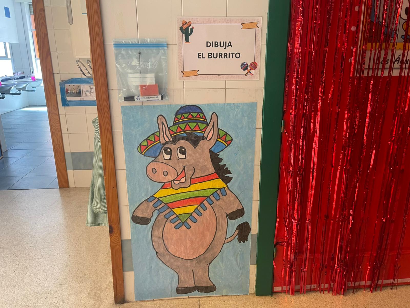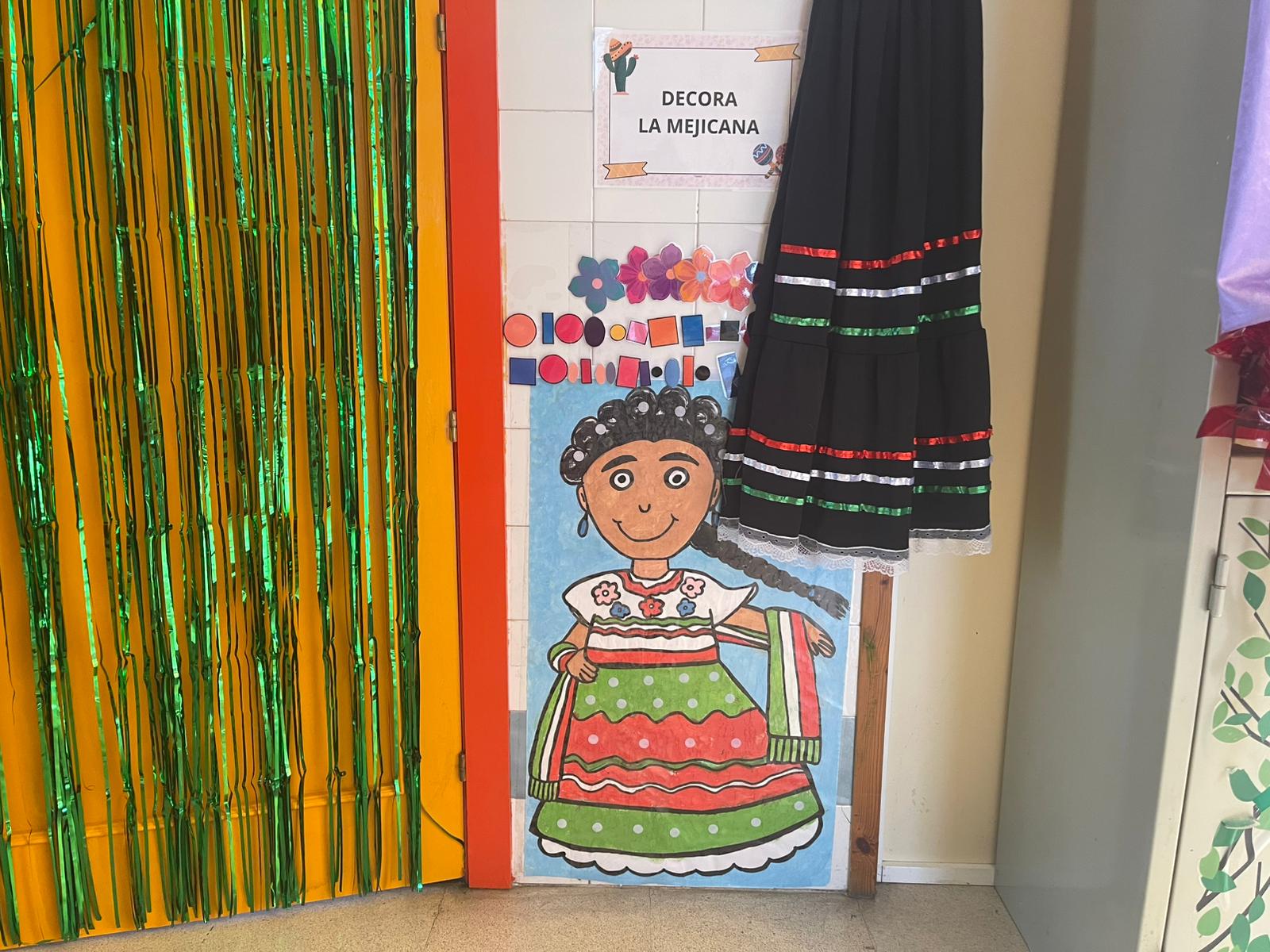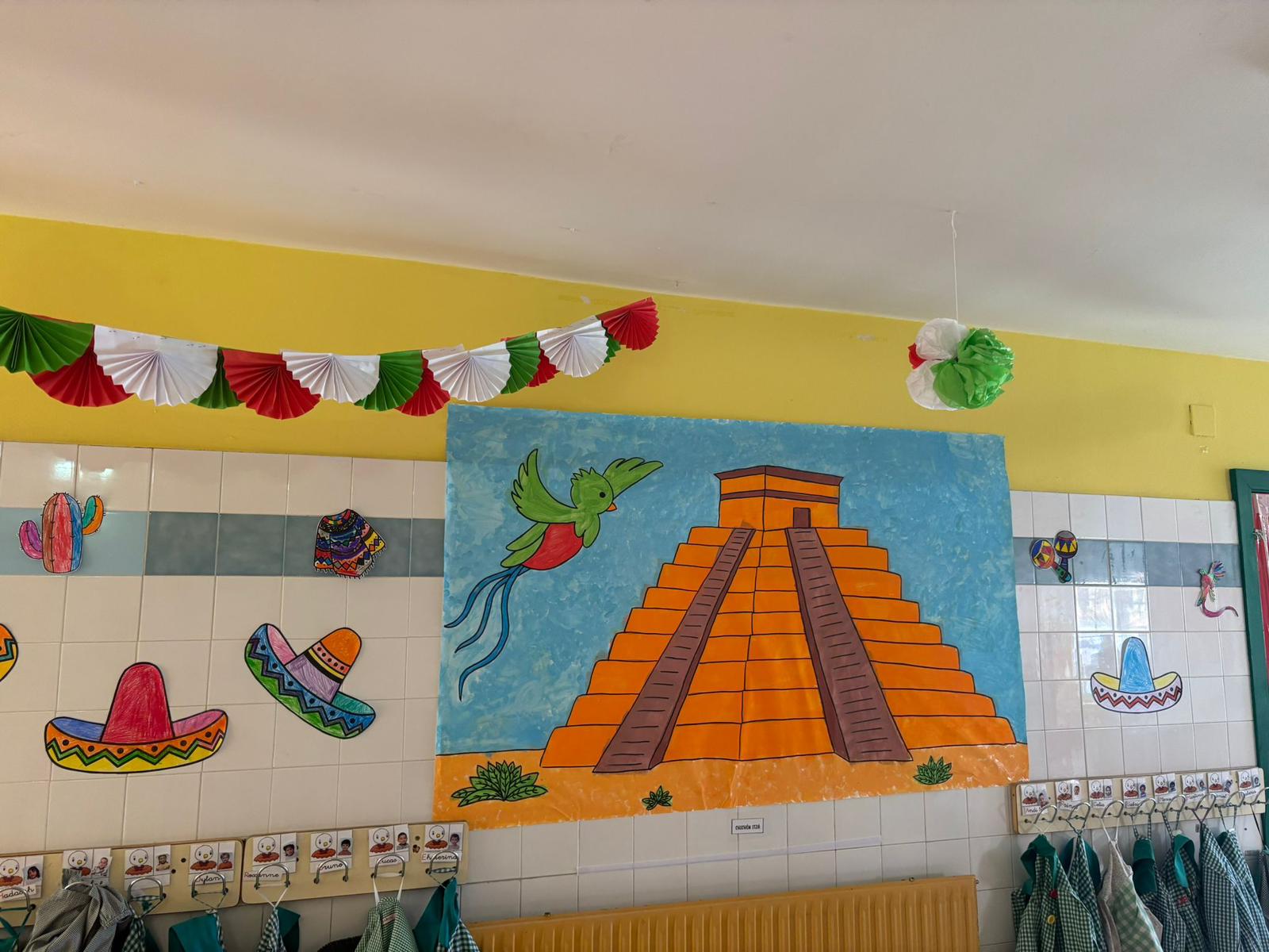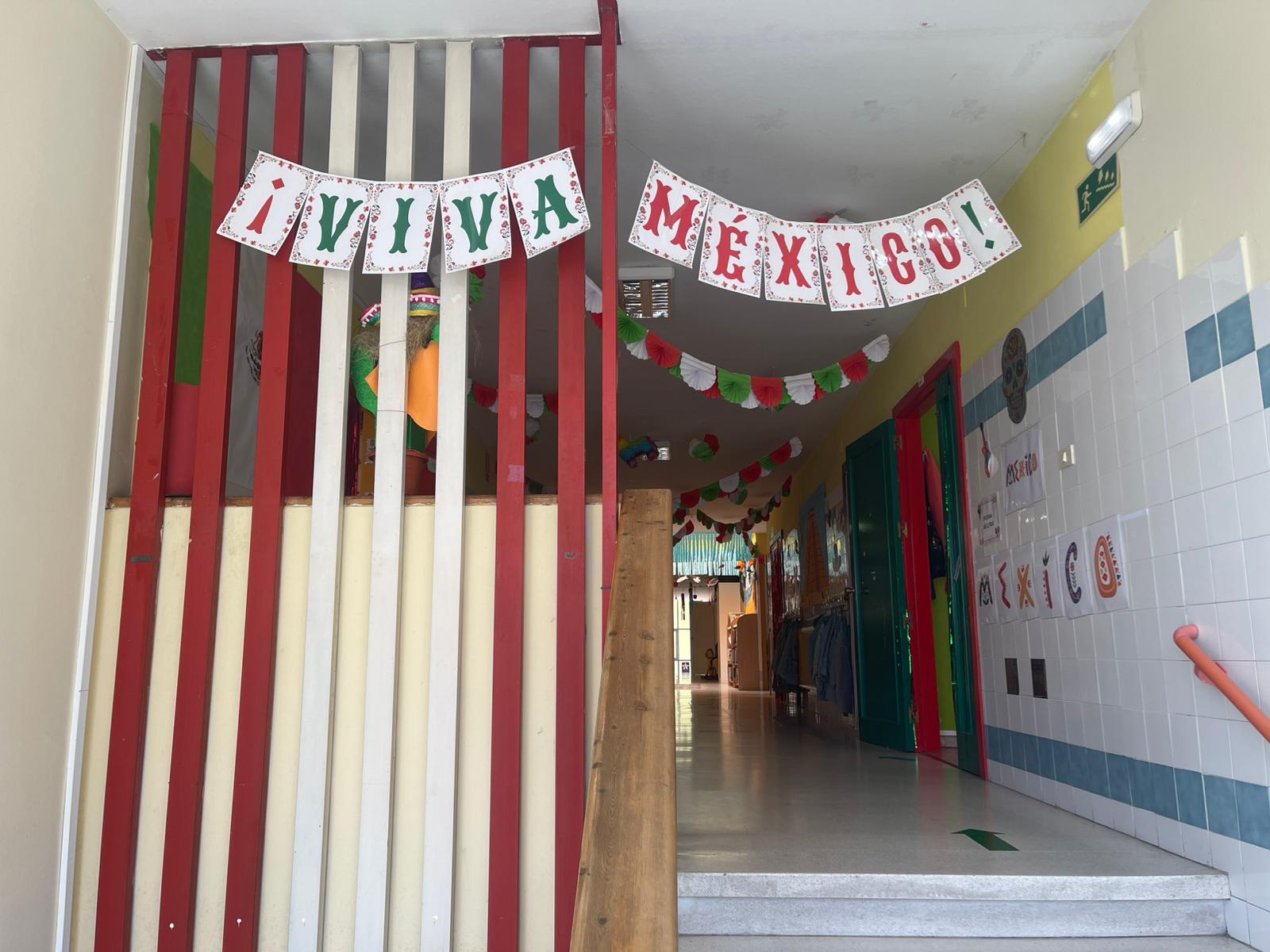 El pasillo de México está decorado con dibujos realizados por los niños inspirados en elementos de la cultura mexicana, aportando un ambiente colorido y creativo. A lo largo del espacio se colocan guirnaldas con los colores de la bandera, que refuerzan la ambientación.