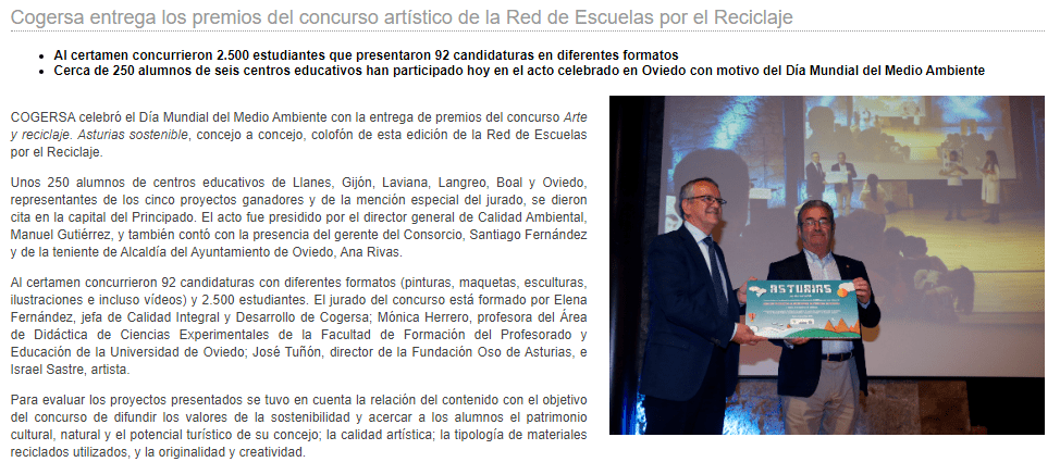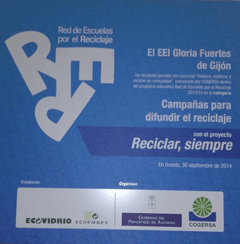 En el  curso 2012- 2013,  el 5 de junio de 2013 en el  Día Mundial del Medio Ambiente. COGERSA nos hace entrega del premio en el  concurso escolar de microcortos: “NO TE CORTES, RECICLA”.  (Red de Escuelas por el Reciclaje 2012-2013).
