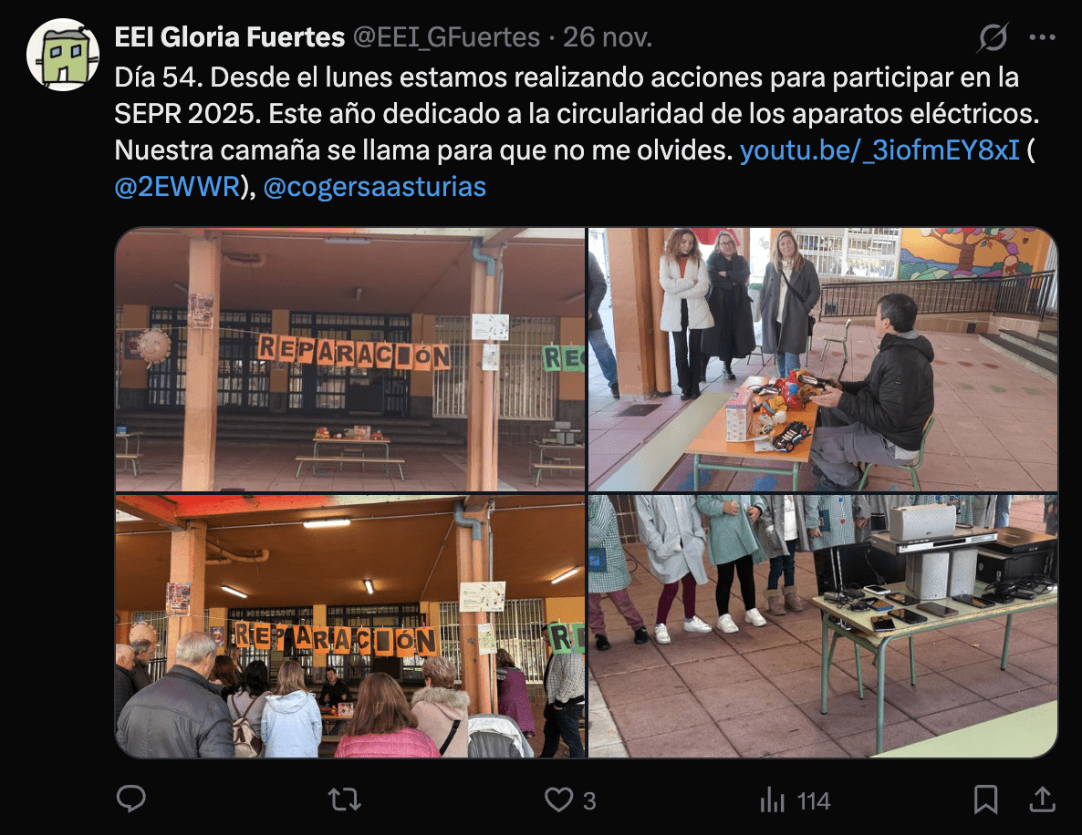 Entre el lunes 24 y el viernes 28 de noviembre, la EEI Gloria Fuertes celebra la Semana Europa de la Prevención de Residuos en colaboración con Cogersa. Este año está dedicado a la circularidad de los aparatos eléctricos y electrónicos. Para más Información, ver la pagina general (https://ewwr.eu/esp/) o la pagina del instituto español del medio ambiente (https://www.ismedioambiente.com/eventos/semana-europea-de-la-prevencion-de-residuos-ewwr-2025).
